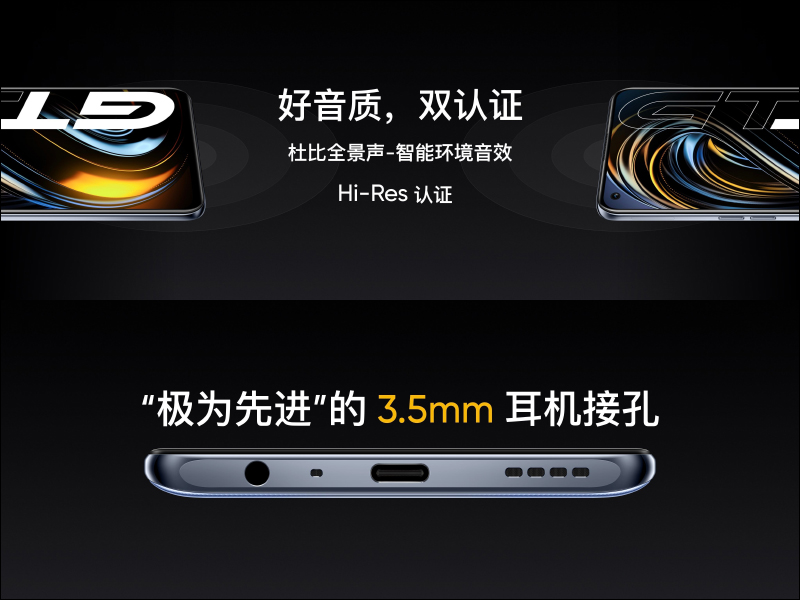 音效方面, realme GT 搭載立體聲雙揚聲器,通過 Dolby Atmos(杜比全景聲)和 Hi-Res 雙認證並支持智慧環境音效,即便在吵雜環境也可清晰聽歌。此外, realme GT 仍然保留 3.5mm 耳機接孔: