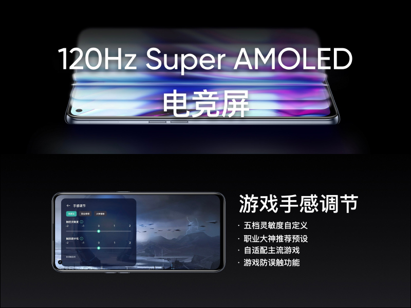 螢幕方面, realme GT 配備 6.43 吋三星 SuperAMOLED 螢幕,擁有 91.7% 超高螢幕佔比,螢幕除了支持最高 120Hz 螢幕更新率,也擁有 100% DCI-P3 廣色域、 98% NTSC 飽和度,螢幕也配備前後雙環境光感應器,可支持 4096 級亮度調節。同時 realme GT 採用光學螢幕下指紋辨識技術。