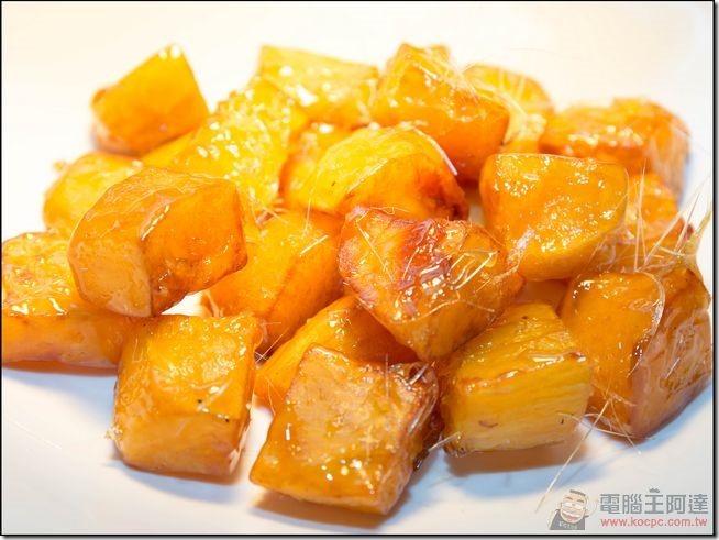 其中「甜在心地瓜」就是台灣講的「拔絲地瓜」外面包覆了麥芽糖後泡冰水,外脆內硬,真的是相當好吃的甜點: