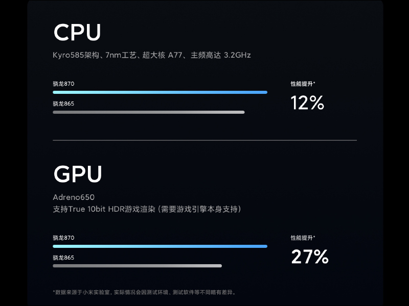 相較於去年搭載 Snapdragon 865 的小米 10 Pro ,這次搭載 Snapdragon 870 的小米 10S 在 CPU 性能提升 12% 、 GPU 性能提升更達 27% :