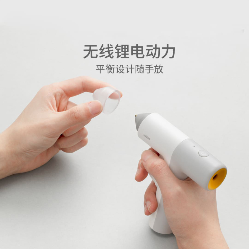 HOTO 小猴最新在小米有品開啟眾籌的新品「HOTO 小猴鋰電熱熔槍」外觀設計相當簡潔,整台機身淨重僅有 195 公克,只需一鍵啟動並等待加熱指示燈長亮時即可出膠使用,簡易的操作流程即便兒童也可以輕鬆操作。
