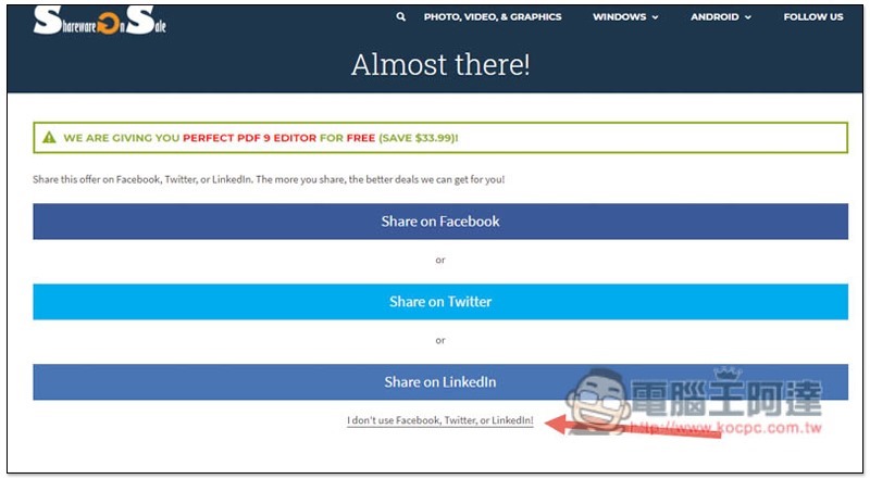 這次下載的安裝檔也是 SharewareOnSale Hub,意味著需透過這套來下載真正的 PERFECT PDF 9 EDITOR 安裝檔: