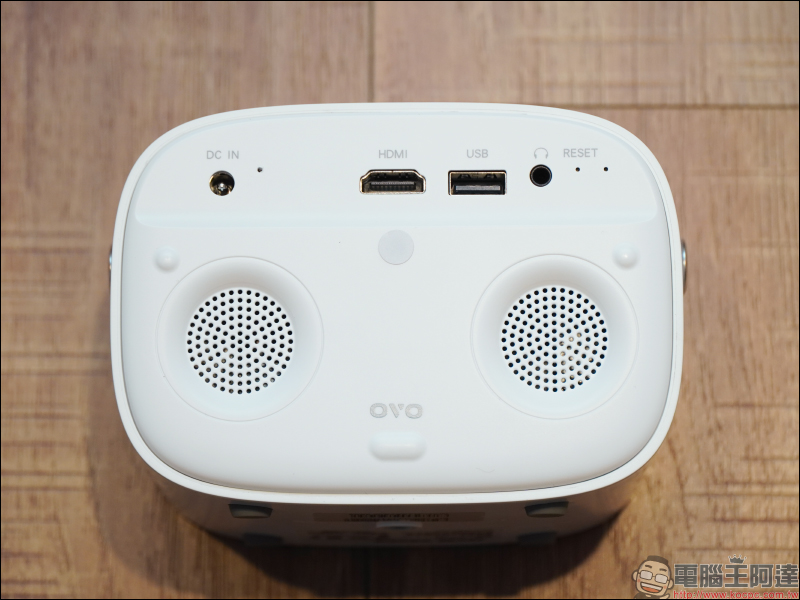 接著看到 OVO U5 機身後方的連接埠配置,由左至右依序為電源接孔、HDMI 連接埠(最高可進行 4K 60FPS 格式信號解碼)、 USB 連接埠、 3.5mm 外接音源孔等,已能滿足一般人的基礎連接需求。內建揚聲器部份, OVO U5 搭載一對雙聲道揚聲器( 3W*2),以筆者個人使用下來其實它的音量和音質表現還算不錯。當然,如果針對音效更高要求的用戶,無論是藉由藍牙無線連接或 3.5mm 外接有線音源都很方便。
