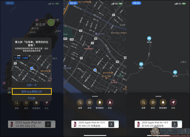初次開啟「垃圾車」App 的時候,建議先允許應用程式取用位置,以方便日後再追垃圾車更快速能尋找周圍的垃圾車位置。在地圖上,會顯示當下有在工作中的垃圾車停靠點:
