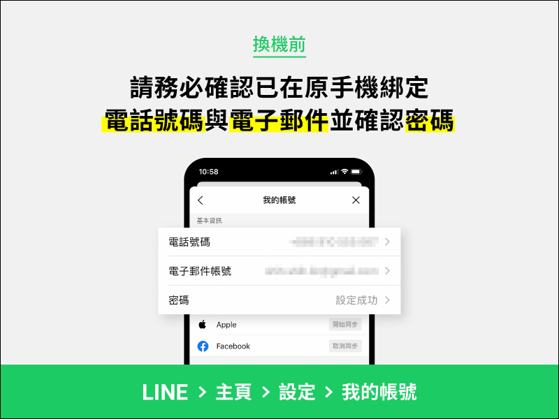 這次的 LINE 換機,建議先將 LINE 應用程式更新至 LINE版本在 9.2.0(含)以上之版本。接著在換機之前,建議務必再次確認原本的手機的 LINE App 已經綁定電話號碼、電子郵件並設定密碼: