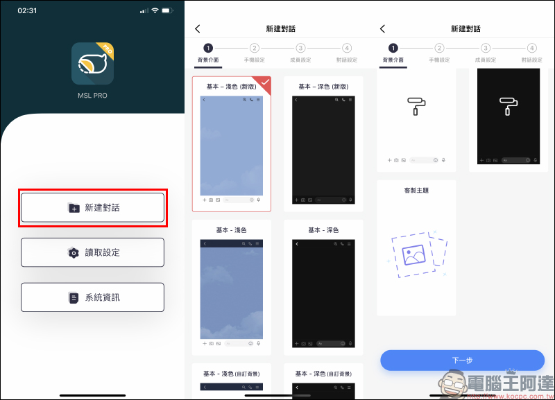 首先開啟 MSL PRO APP 進入主畫面後,選擇「新建對話」即可建立 LINE 聊天室的背景介面。 MSL PRO 內建了本的淺色和深色 LINE 佈景主題,回顧 2020 年底 LINE 10.21.0 版本更新改為更簡約的新版介面, MSL PRO 目前也已有提供新版的聊天室背景的介面供用戶選擇,讓製作 LINE 聊天室對話截圖看起來更加真實。