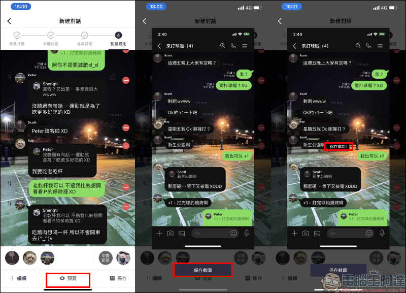 若要將製作好的 LINE 模擬聊天對話存成截圖,只需點選編輯頁面的「預覽」後按下「保存截圖」即可: