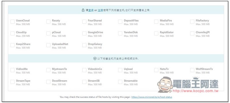 點我進到 Mirrored.to 網站之後,下方可看到支援的所有免費空間,最上方 21 個都能匿名上傳,如:GoFilelo、DownloadGG、TurboBit、SolidFiles、ZippyShare、UsersDrive 等等,把你想上傳的空間打勾即可。每次上傳每一個免空的單一檔案最大都限制 500MB,數量則達到 20 個: