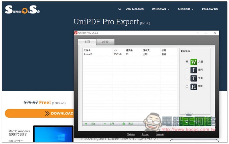 雖然現在網路上有很多 PDF 轉檔工具,但要把文件上傳到網站,這對很多人來說一定會擔心安全性的問題,也因此能用離線桌面版還是最好。而最近國外知名限免網站就有一套還不錯的 UniPDF Pro Expert 專業轉檔軟體正釋出免費活動,原價 29.97 美金,評分高達 92%,而且一個序號可用在 3 台電腦,且商業用途也沒問題,不過限免時間剩不多,有興趣人的可別錯過。