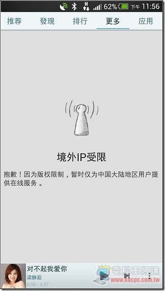 現在您再開啟天天動聽應該就會看到這個畫面,恭喜你!被中國牆了: