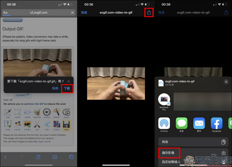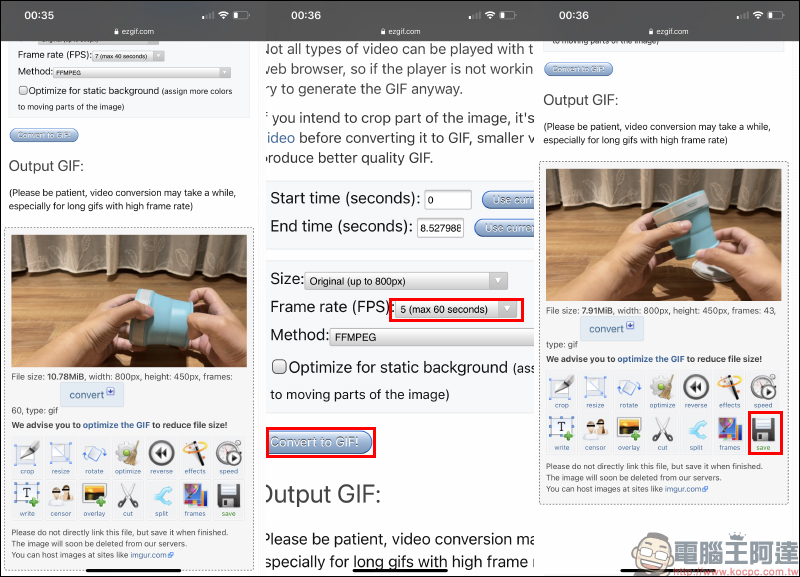 成功轉換為 GIF 檔後畫面下方會顯示預覽畫面,如果當前的效果不滿意也能滑動到畫面上方重新設定幀數(像是調整到最低的 5fps),接著再次點擊「Convert to GIF(轉換為 GIF)」即可重新轉換。完成後,即可點選「Save(儲存)」將該 GIF 檔案下載到裝置。