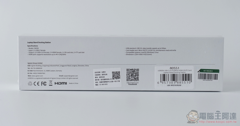 盒裝背後標示著完整的規格說明,還有很重要的防偽標籤貼 – 千萬認明綠聯的官方購買管道,不要買到假貨了。原廠公司貨才有通過安規與穩定傳輸效能的保證啊!: