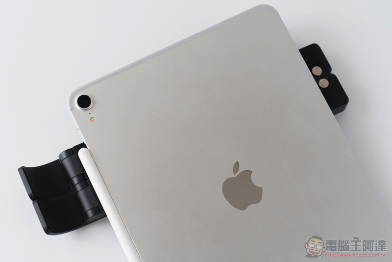 側面看比較明顯。X-Kit 不僅在與裝置的接觸面都把防滑防碰撞材質貼好貼滿,支架折疊的機制也沒忘了好好地躲藏在表面下,所以不太需要擔心操作時會有刮傷裝置的問題: