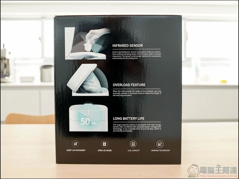外箱側面則是標示了拓牛 T Air X 全自動垃圾桶的幾個主要功能,這次主打感應開蓋更快,超裝垃圾一樣可以打包還有超長續航(外盒寫50天,最新版本已經改為60天了):
