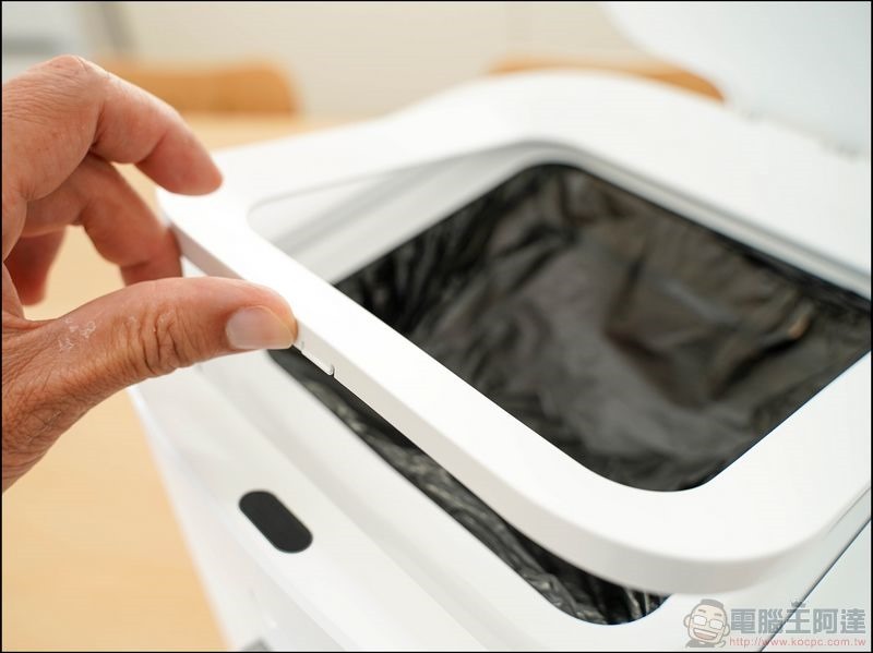 講了這麼多,大家應該也會好奇,裡面的垃圾袋用完了怎麼辦?更換也很簡單,只要打開上蓋,在桶口最上層的蓋子就可以取下: