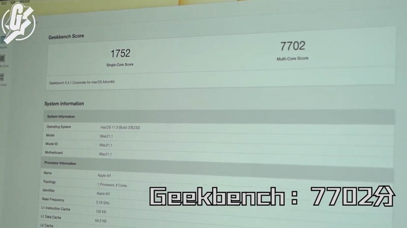幾天前 Geekbench 已經有 M1 iMac 的跑分出現,比對這部影片後,分數幾乎一樣,因此確定是真的,相較於 Intel 版無論是 i3 還是 i7,效能都獲得大幅提升: