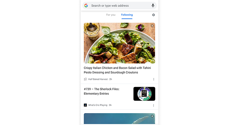 簡單的講,就是在 Google 瀏覽器的選項裡,現在新增了個「Follow」的快速訂閱按鈕 – 這裡用得就是當初 Google Reader 放棄的那個 RSS 訂閱功能。使用者將可以在標籤頁「For you」一旁的跟隨頁面裡,像以往那樣看到該網站的最新發文與縮圖列表,快速掌握最愛網站的一切動態。
