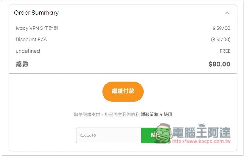 進入 Ivacy 官網之後,就會看到目前推出的 87% 折扣優惠,5 年計劃每月約 1.33 美金,這已經相當便宜了,但電腦王阿達讀者結帳時輸入「Kocpc20」的折扣碼,還可以再享額外優惠,每月變成 1.06 美金,少喝一瓶飲料就有。
