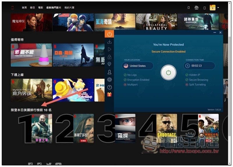 打開 Ivacy 連接到你要看 Netflix 的位置伺服器,如:美國 Netflix 就連美國,接著進到 Netlfix 後就會看到影片庫變成美國: