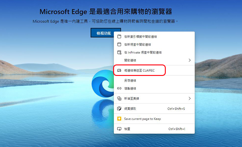 你還可以在網頁上任意處用滑鼠右鍵點一下並選擇設備來進行共享。正如下方截圖中看到的一樣,當你按下右鍵後,會出現一個前方是小小筆電和手機的圖示,點選這個圖示就可以直接將該網頁連結發送到選擇的裝置。當然,如果你目前沒有在其他設備上使用 Edge,這個選項就不會出現。