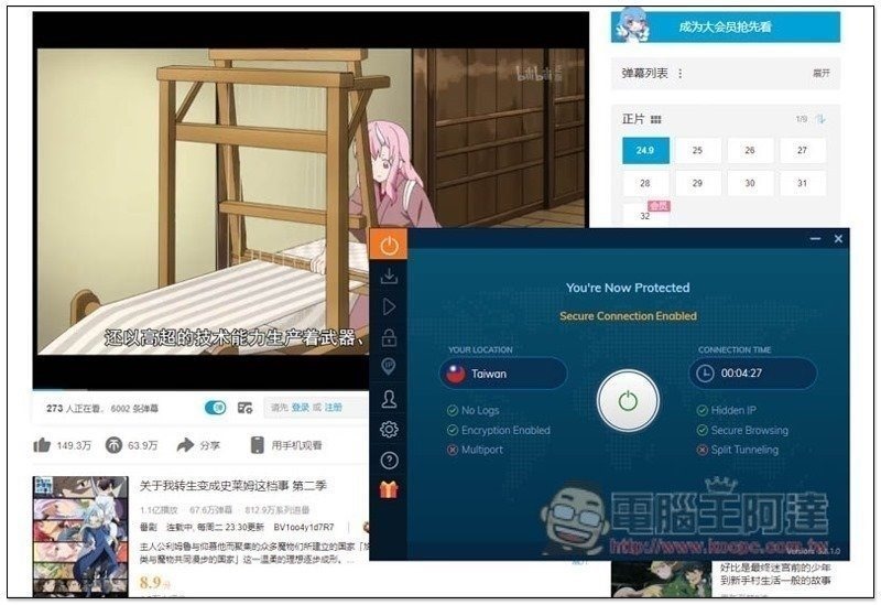 這是 Ivacy 一個非常獨有的功能,有在看中國 B 站影片的人都知道,某些高品質的動畫作品,台灣是看不到的,都會跳出版權限制的訊息,利用 Ivacy 就能解決這個問題,而且方法還非常特別,連接 “台灣伺服器”。