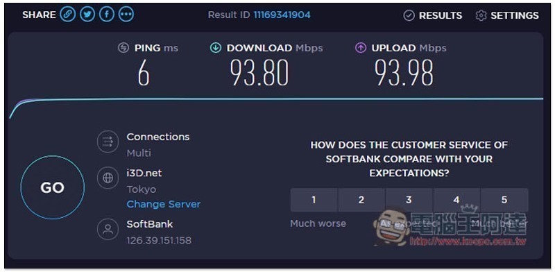 我人目前在日本,因此先測試日本伺服器,速度幾乎沒影響,下載依舊有 92.71Mbps、上傳 93.80Mbps,Ping 也是 6ms: