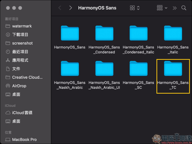 下載後將字型檔解壓縮就會看到 HarmonyOS Sans 字型的所有資料夾,包括 HarmonyOS Sans、 Italic(斜體)、Condensed(壓縮字元寬度)與 Condensed Italic 樣式。若只想下載繁體中文版本字型可點選「HarmonyOS_Sans_TC」資料夾,而簡體中文則是「HarmonyOS_Sans_SC」資料夾。