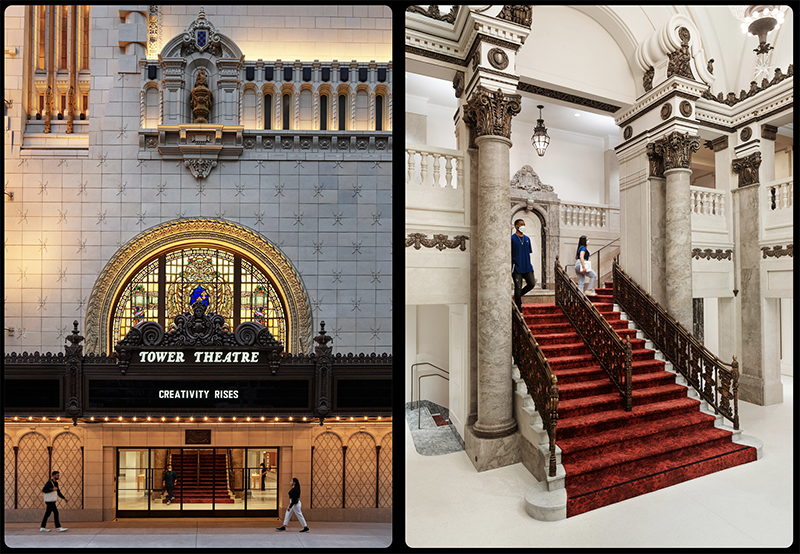 即將在美國時間週四上午正式開幕的 Apple Tower Theatre。其前身是由著名電影劇院建築師 S. Charles Lee 所設計、在娛樂領域有著一定地位的洛杉磯當地,首個專為有聲電影而來的劇院。這棟以巴黎歌劇院為靈感打造宏偉大廳、華麗拱形樓梯,內在更是有著包括賽璐珞彩繪玻璃窗、精緻雕刻與雲彩穹頂;外在的經典百老匯大遮蓬還有直式招牌以及鐘塔的劇院。
