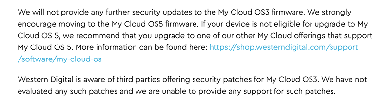 而就官方對此漏洞的公告,是已經確認舊版的 My Cloud OS 3 將不再提供任何的安全韌體升級。因此,對於這些不能升級(目前)安全的新系統的使用者而言。選項就只剩下買一台新的,或者是就官方以往所講的那樣,可以把網路硬碟最主打的遠端功能給關閉。