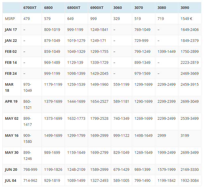 根據德國 3DCenter 網站最新統計報告,AMD 與 NVIDIA 的價格高峰落在 5 月中,隨後就開始崩跌,特別是 NVIDIA,雖然 6 月中有一度緩下來,AMD 顯示卡甚至還小漲一下,但好景不常,半個月又跌了 30~40%: