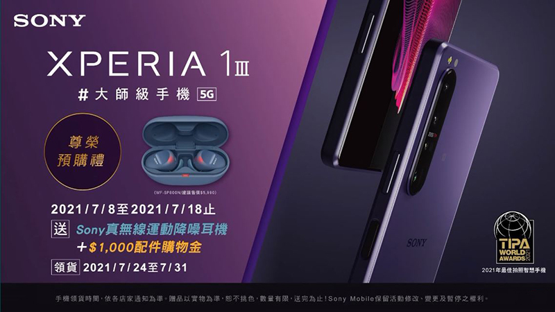 Xperia 1 III 將於即日起正式開放預購,自 7/8 至 7/18 止,至 Sony Mobile 行動通訊專賣店、Sony 直營店,以及線上通路(包含 Sony 台灣官方購物網站、PChome 購物、Yahoo 奇摩購物中心、Momo 購物網、蝦皮購物 Sony 官方授權旗艦店、神腦線上、friDay 購物等指定店家及通路,搶先預購 Xperia 1 III 大師級 5G 旗艦手機,即可獲得 Sony 真無線運動降噪耳機 (WF-SP800N,市價5,990元),還可獲得 1,000 元配件購物金或配件購物組。