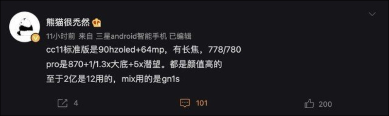 近日熊貓很禿然微博爆料小米 CC 系列的規格重點,其中小米 CC 11 標準版預計採用 90Hz 更新率 OLED 螢幕、搭載高通 Snapdragon 778 或 Snapdragon 780 處理器,搭載 6400 萬像素主相機並包括長焦鏡頭。