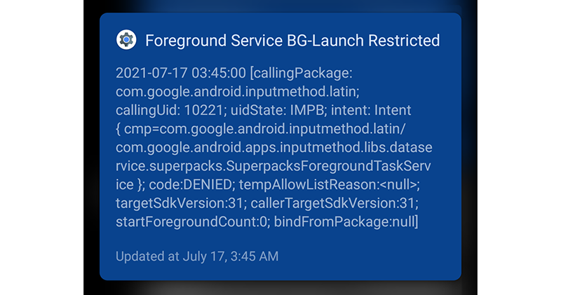 據稱,近日有不少升級 Android 12 Beta 3 的使用者,突然收到一大串「Foreground Service BG-Launch Restricted」的通知。其中的「App restricted: com.google.android.inputmethod.latin」描述則是沒有明確指出導致此系統通知的應用是哪個。