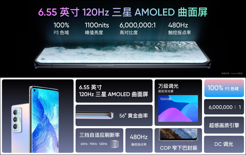 螢幕方面, realme GT 大師版則採用三星 Super AMOLED 平面螢幕,支持最高 120Hz 螢幕更新率和 360Hz 觸控取樣率,螢幕也搭載螢幕下指紋辨識、 DC 調光、 100% DCI-P3 廣色域、HDR 顯示、以及 5,000,000:1 高對比度。