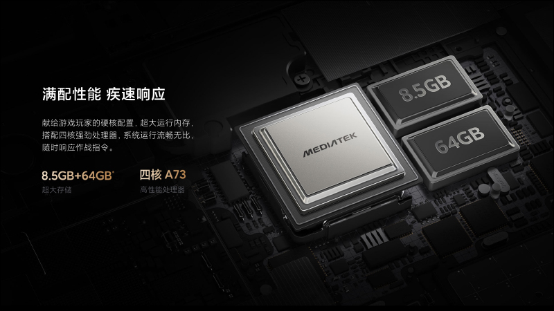 性能方面搭載四核心處理器、8.5GB RAM 和 64GB ROM 。