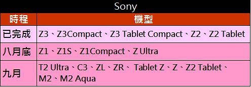 已可升級: 所有Z系列(Z3、Z3 Compact、Z3V、Z3 Dual、Z1、Z1 Compact 、 Z Ultra…)、 Xperia T2 Ultra 、C3。