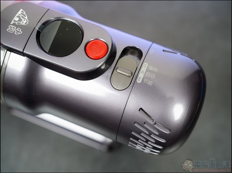開啟自動檔位時會依照紅外線分析氣流所偵測到的灰塵量以調整吸力大小,紅色的電源開關採用一鍵啟動的設計,短按為開啟關閉,長按則是吸塵與拖地工作模式切換開關,雖然跟目前常見的「扳機式」開關方式不同,但使用起來依然相當直覺: