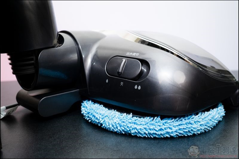 而小狗T12 最重要也是個人覺得設計的最棒的就是這組旋轉擦地刷,它採用了吸口前置的設計,後方則是兩片可更換拖布的對旋機構,可以做到一般後掛拖布型的拖地吸塵器無法深度地板清潔的狀況,而且前方一樣有 LED 燈的設計,讓使用者更方便清理家具下方的陰暗死角: