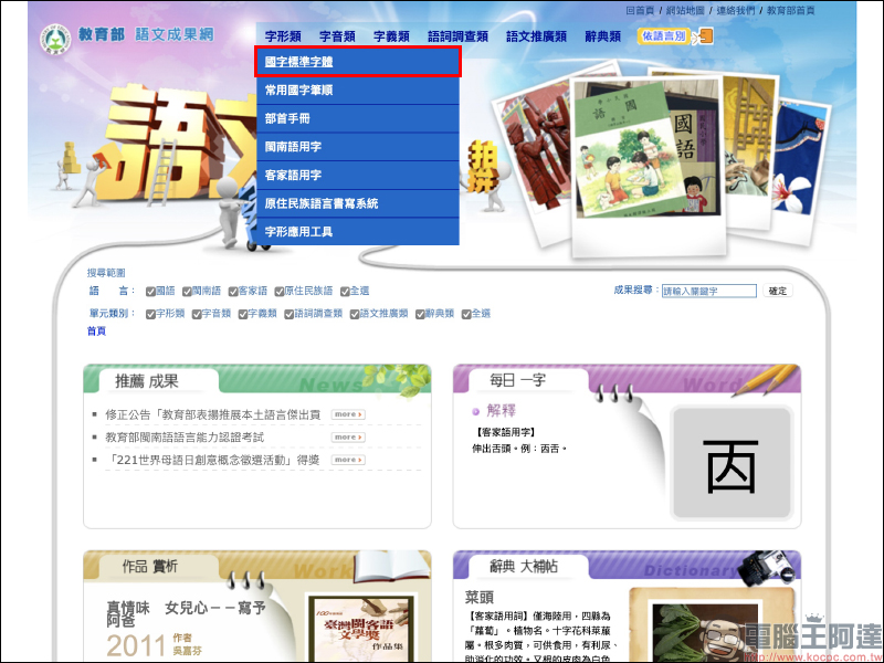 首先,開啟「教育部語文成果網」後,點選「字型類」>「字形應用工具」。