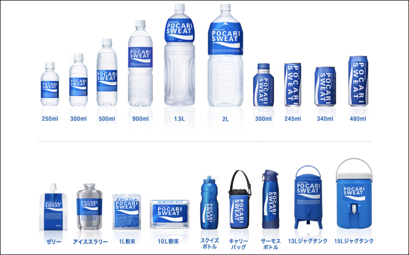 在日本當地販售的寶礦力水得版本超級多,光是寶特瓶和鋁罐就有分各種容量,滿足不同情況的水分與電解質補充需求。另外,也有袋裝、粉裝、桶裝等不同的容器。