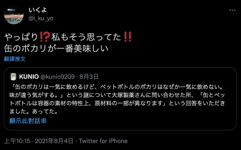 最近在日本也有網友表示「寶礦力水得」鋁罐裝喝起來比寶特瓶的版本好喝,但一直以來都不知道其中有什麼差異。直到近日詢問廠商才發現原來在原料配方就有些不同。發文後也有許多網友有相同的感覺,不知道大家是喜歡哪一派包裝的飲料呢?
