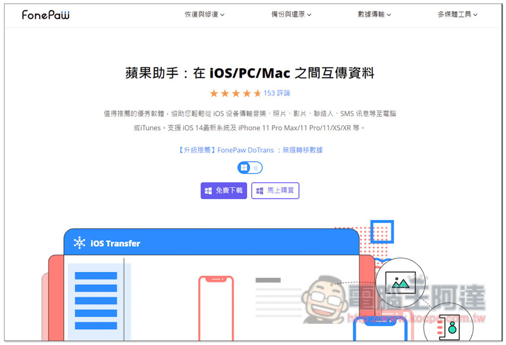 我們更推薦 FonePaw 蘋果助手這套軟體,Windows、Mac 版都有,操作超級簡單,不太懂電腦的人也能輕鬆上手,只需要幾個步驟,iPhone/iPad/iPod 就能輕鬆與電腦互傳照片、影片、音樂、電子書等等,也支援資料備份功能,可以幫你將 LINE 聊天記錄保存到電腦,不再擔心找不到 LINE 重要訊息。