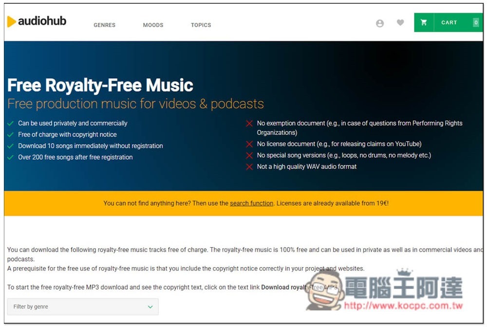 audiohub 的首頁就有明確說明這些音樂可用在哪些地方,個人、商用皆可,不過需要註冊才能下載,下載前可以試聽,音樂品質都很不錯。