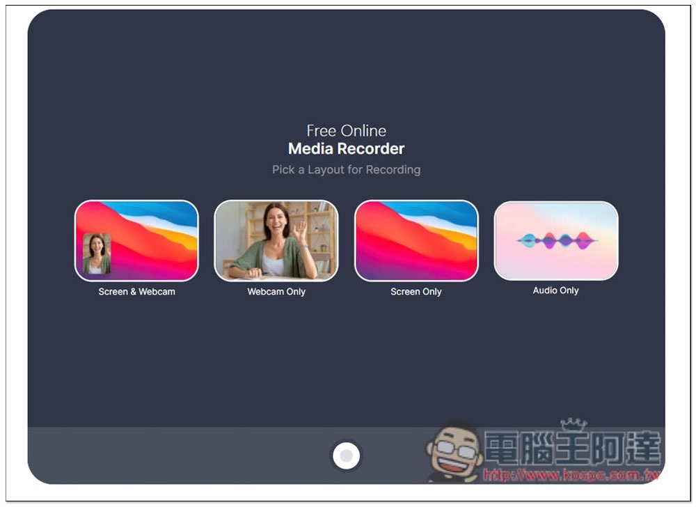 支援純聲音、純螢幕畫面、純視訊鏡頭、或螢幕畫面 + 視訊鏡頭 4 種模式,看你要用哪一種: