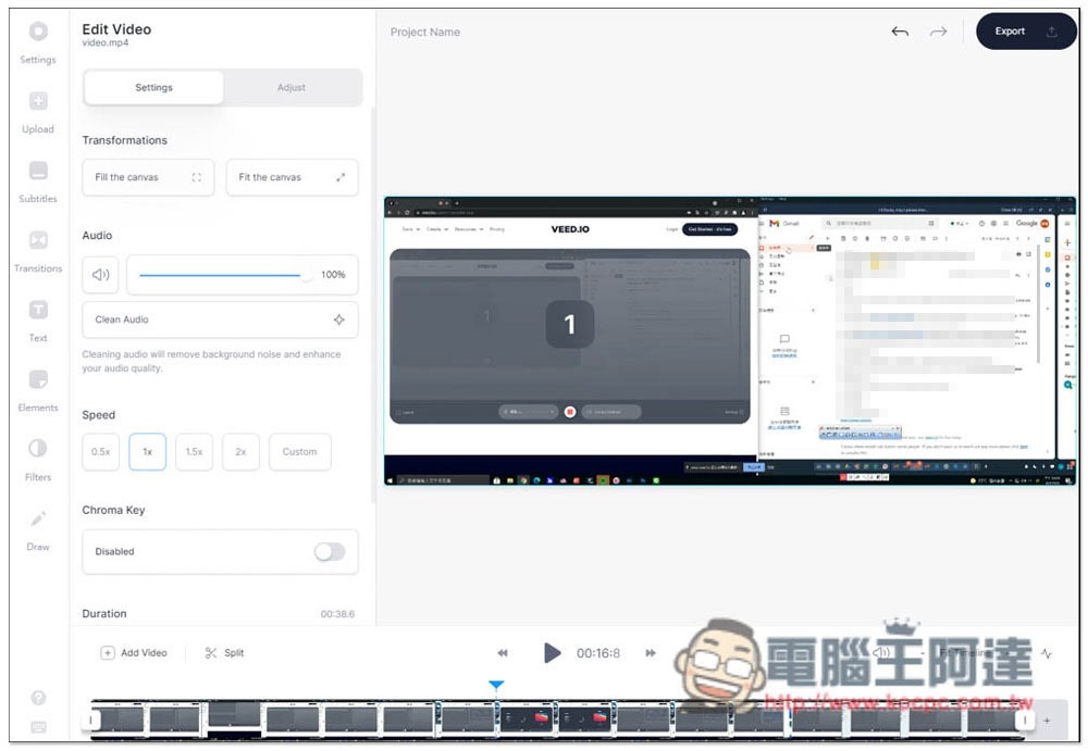 不過要注意是,剪輯功能需註冊會員才能使用。下載影片就按右上方的 Export 功能: