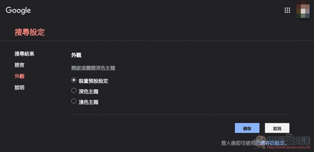 也可以到 Google 搜尋的設定頁面(點我直接前往頁面),找到「外觀」就能更深入選則是否要根據桌面系統的主題設定變換深色/淺色主題:
