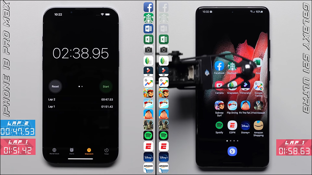 雖然 iPhone 13 系列搭載 Apple A15 仿生晶片性能強大,但對一般使用者來說每天開啟各種應用程式的反應速度還是最有感的。最近 PhoneBuff 在 YouTube 分享一段讓 iPhone 13 Pro Max 和三星 Galaxy S21 Ultra 比較開啟應用程式的速度。這項測試以機器人進行操作,並分為首次開啟的時間和第二次開啟的時間進行記錄,依序開啟像是 Facebook、Starbucks、Word、Excel、相機、Snapseed、Spotify、Disney+ 以及遊戲等應用程式。