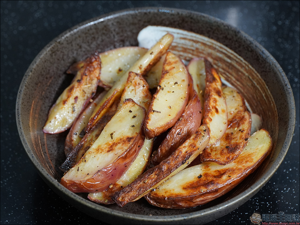 米家 App 內建的「香脆薯塊」預設為 200°C 烹飪 17 分鐘,不過這食譜仍可依照個人使用的份量、食材狀況以及個人口味喜好自行調整。氣炸鍋料理期間,也能拉開檢視食材熟度狀況。另外,若設定的料理時間超過 8 分鐘,在滿 8 分鐘時會提醒用戶「請抽鍋翻動」食材,讓食材兩面的熟度都更均勻。結束標準的料理時間後,由於希望薯塊的色澤能更深、帶點焦脆的口感,於是另外再多加熱 3 分鐘(200°C),最終呈現出來的效果如下圖: