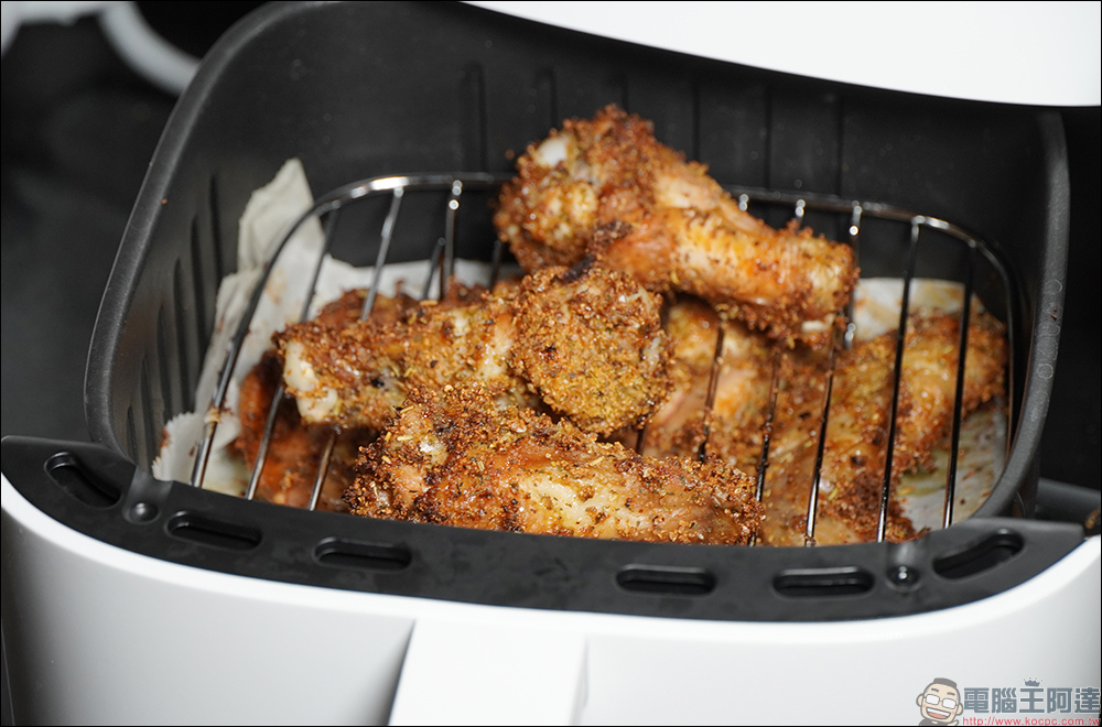 小米智慧氣炸鍋 3.5L 設定 180°C 加熱 10 分鐘,再用 200°C 加熱 3 分鐘的成果呈現如下,各位也能依照口味的喜好,將設定調整為 180°C 加熱 15 分鐘。