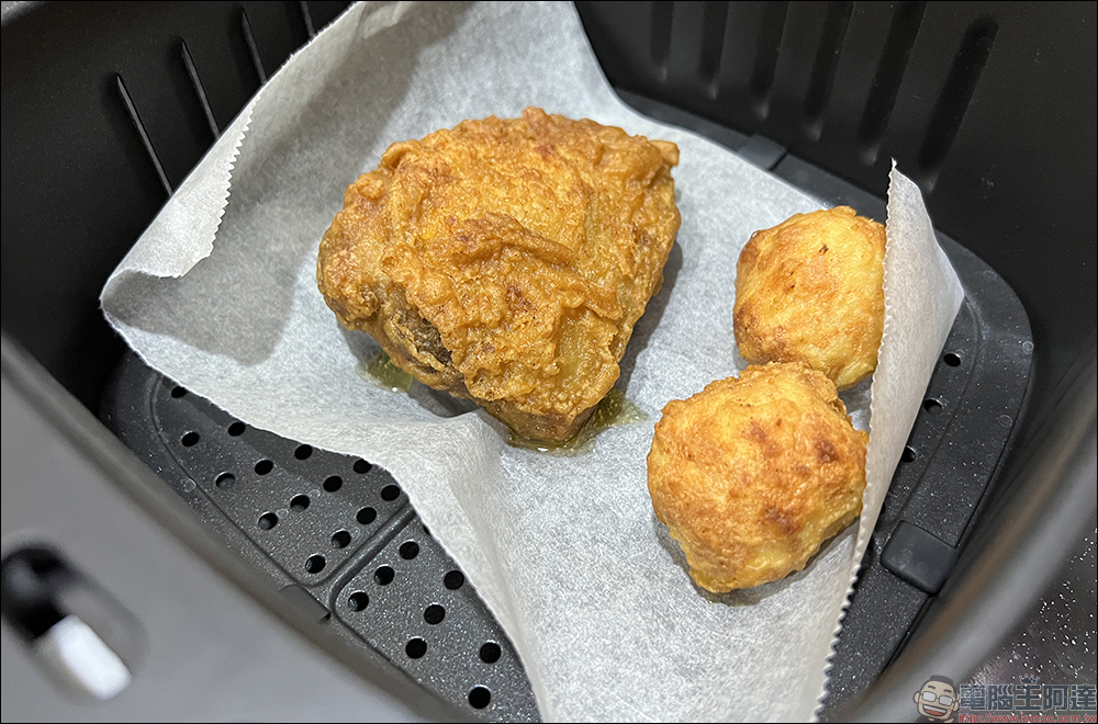 可以看到炸雞在氣炸鍋料理幾分鐘內,就逼出許多油脂。